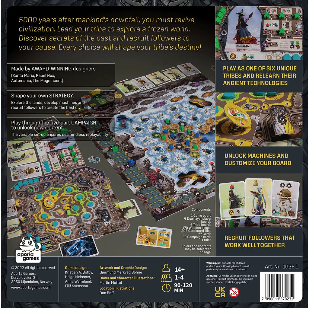 At the beginning of the game, each player gets a set of citizen cards, a tribe board, as well as a huge dual-layer player board. The tribe board shows your unique tribe ability and the ancient technologies that you may relearn during the game. The dual-layer player board is where you place your custom machines and upgrade your card slots.