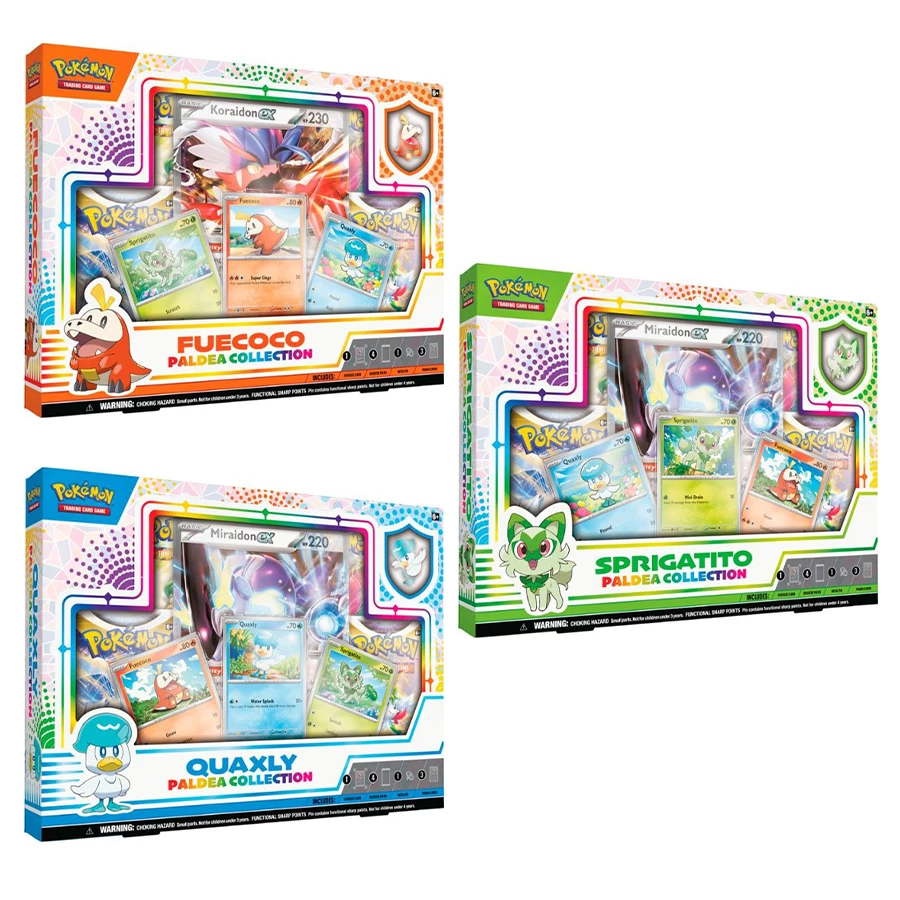 Get ready for a brand-new adventure in the Paldea region with the Pokémon Trading Card Game! First partner Pokémon Sprigatito, Fuecoco, and Quaxly join your collection as foil promo cards, and an enamel pin lets you show off your chosen Pokémon everywhere you go. Discover even more with booster packs and an oversize card featuring the Legendary Pokémon Koraidon or Miraidon as a powerful Pokémon ex!