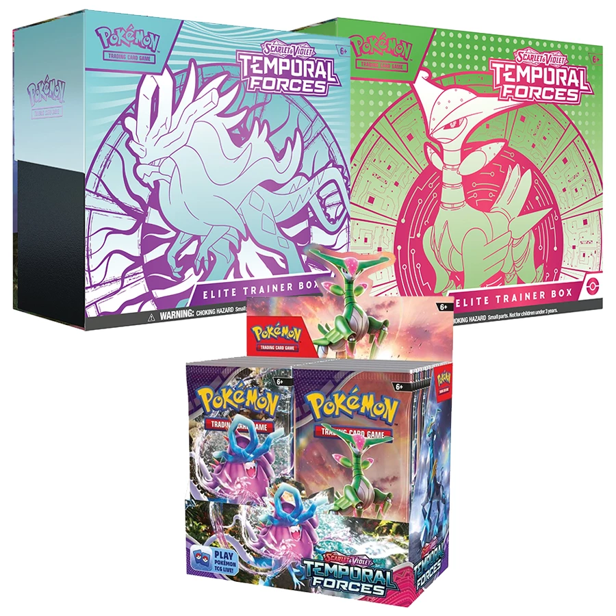 The ranks of Ancient and Future Pokémon continue to grow! Walking Wake ex breaks free of the past alongside Raging Bolt ex, while Iron Leaves ex delivers high-tech justice with Iron Crown ex. Outside Area Zero, Wugtrio and Farigiraf shift types as Tera Pokémon ex, and Pokémon Trainers everywhere prepare for the return of ACE SPEC cards with uniquely powerful effects. A rupture in time brings wild beasts and cyber visions to battle in the Scarlet & Violet—Temporal Forces expansion!