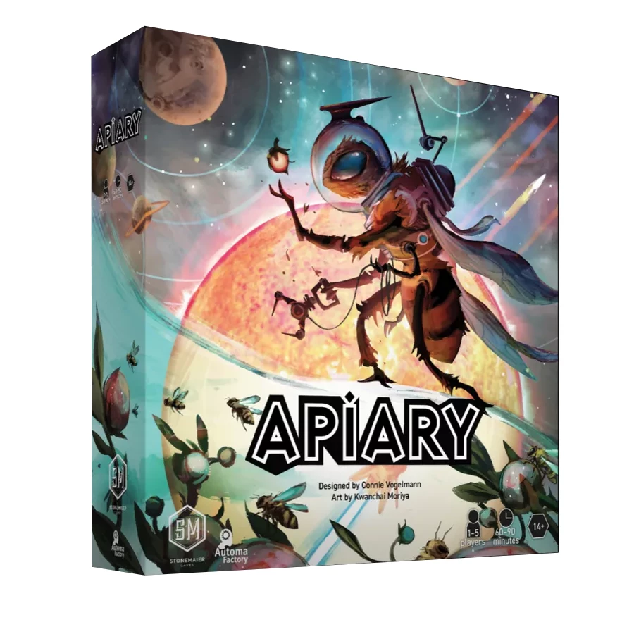 In Apiary, each player controls one of twenty unique factions. Your faction starts the game with a hive, a few resources, and worker bees. A worker-placement, hive-building challenge awaits you: explore planets, gather resources, develop technologies, and create carvings to demonstrate your faction’s strengths (measured in victory points) over one year’s Flow. However, the Dearth quickly approaches, and your workers can take only a few actions before they must hibernate! Can you thrive or merely survive?