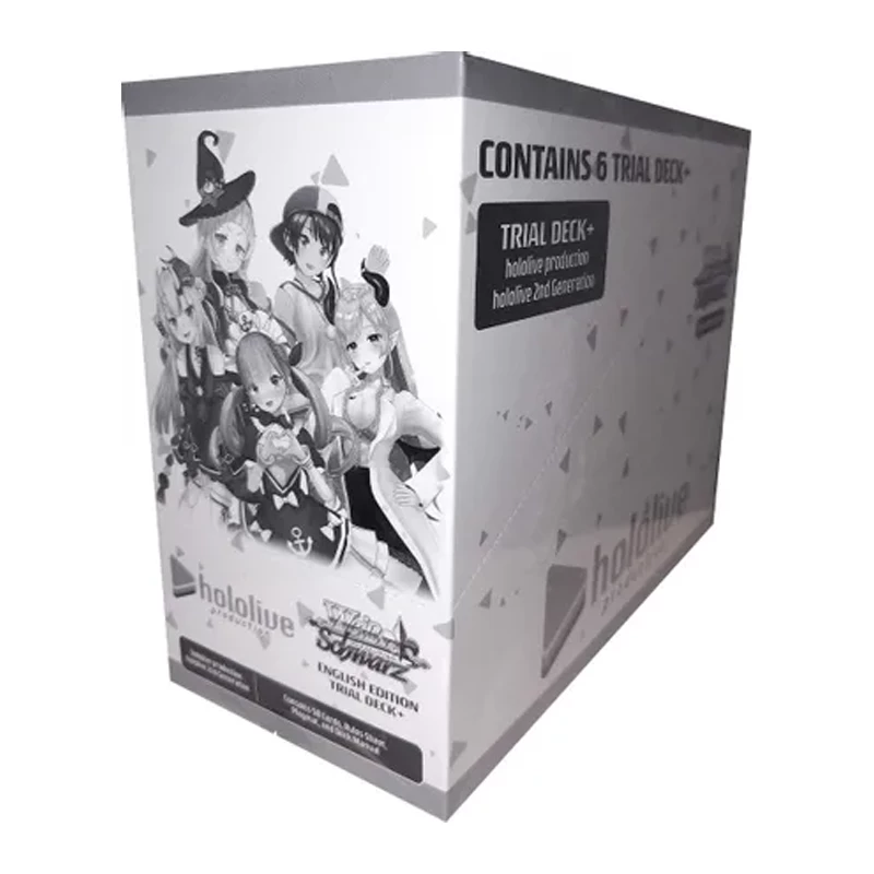 The cards in these Trial Deck+ may be used together with cards which have their card number beginning with “HOL”! This deck features hololive 2nd Generation: Minato Aqua, Nakiri Ayame, Yuzuki Choco, Muraski Shion, & Oozora Subaru