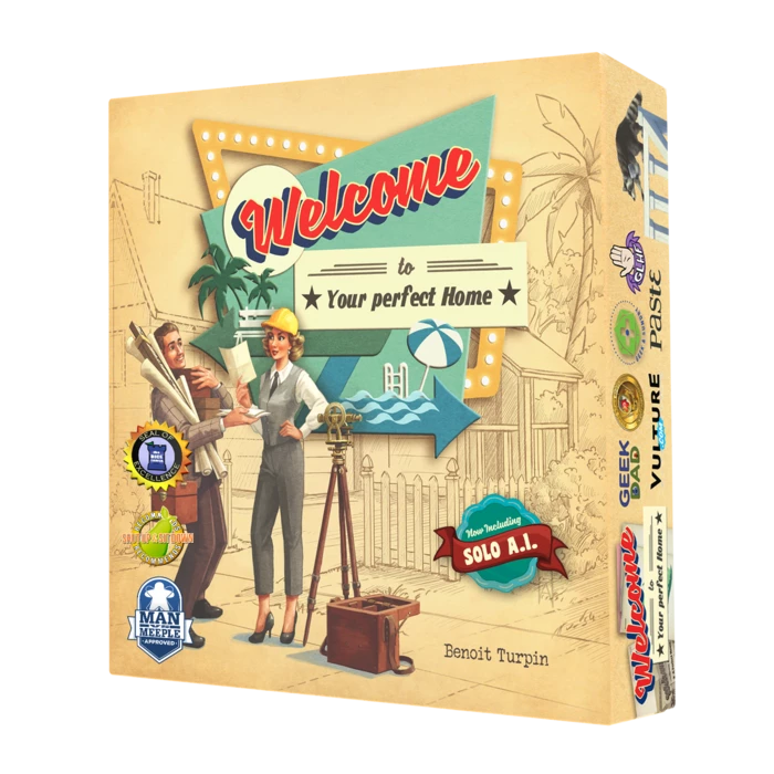 Welcome To… plays like a roll-and-write dice game in which you mark results on a score-sheet…but without dice. Instead you flip cards from three piles to make three different action sets with both a house number and a corresponding action from which everyone chooses one. You use the number to fill in a house on your street in numerical order. Then you take the action to increase the point value of estates you build or score points at the end for building parks and pools. Players also have the option of taking actions to alter or duplicate their house numbers. And everyone is racing to be the first to complete public goals. There’s lots to do and many paths to becoming the best suburban architect in Welcome To…!